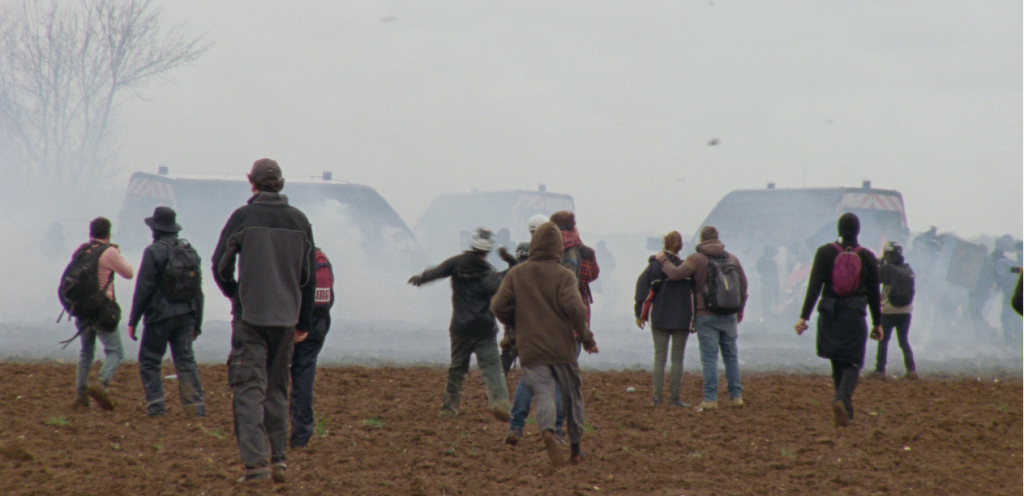 En enero de 2018, la construcción de un aeropuerto en la zona rural de Notre-Dame-des-Landes fue cancelada oficialmente, poniendo fin a años de resistencia liderada por una de las comunidades activistas más importantes de Francia. Entre 2022 y 2023, los cineastas Guillaume Cailleau y Ben Russell se sumergieron en la ZAD (zona a defender) para crear un retrato de la vida colectiva en los años posteriores a este éxito sin precedentes. La obra resultante documenta la transformación de una lucha local en un nuevo movimiento de protesta ecológica, que culminó con la Batalla de Sainte-Soline en marzo de 2023, donde una acción directa colectiva contra la privatización del agua se topó nuevamente con la brutalidad de la violencia estatal. Siguiendo los principios del cine inmersivo y los pasos de algunas obras de Akerman, DIRECT ACTION es un retrato único e hipnótico de una comunidad que no se define únicamente por sus enfrentamientos violentos con el Estado: gracias a su meticulosa observación, los directores documentan un movimiento político profundamente singular, donde aún es posible concebir un mañana mejor.