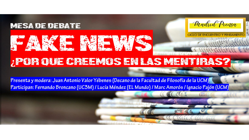 En la era de la sociedad de la información, cuando las redes y las nuevas tecnologías permiten un acceso a los datos más abundante y más rápido que nunca, se presentan, sin embargo, nuevos retos y problemas para las sociedades contemporáneas como los que encontramos bajo términos como fake news o posverdad; términos surgidos hace muy poco tiempo y que, sin embargo, se han popularizado en nuestro vocabulario cotidiano a gran velocidad. De la mano de cuatro especialistas, periodistas, filósofos y divulgadores trataremos de analizar estos recientes fenómenos, su origen, su importancia y su, más que probable, futuro entre nosotros, en una mesa de debate en la que participarán Fernando Broncano (catedrático de Lógica y Filosofía de la Ciencia en la Universidad Carlos III de Madrid), Lucía Méndez (periodista, analista política y redactora jefe de Opinión de El Mundo), Marc Amorós (periodista y autor del libro Fake News. La verdad de las mentiras falsas) e Ignacio Pajón (profesor de Filosofía Antigua de la Facultad de Filosofía y cofundador de Ediciones Agapea). Presenta y modera Juan Antonio Valor Yébenes (Decano de la Facultad de Filosofía de la Universidad Complutense).